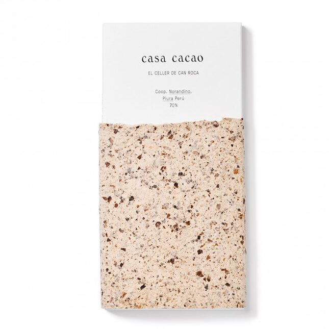 The makers further note: “Cacao from the most prestigious cocoa-producing region in Peru, where the so-called ‘white cacao’ predominates, harvested by small producers in the area. In the Casa Cacao workshop, we hand-select the cacao, roast it, crack and winnow the beans, add organic cane sugar, and conche it for a minimum of 48 hours.”