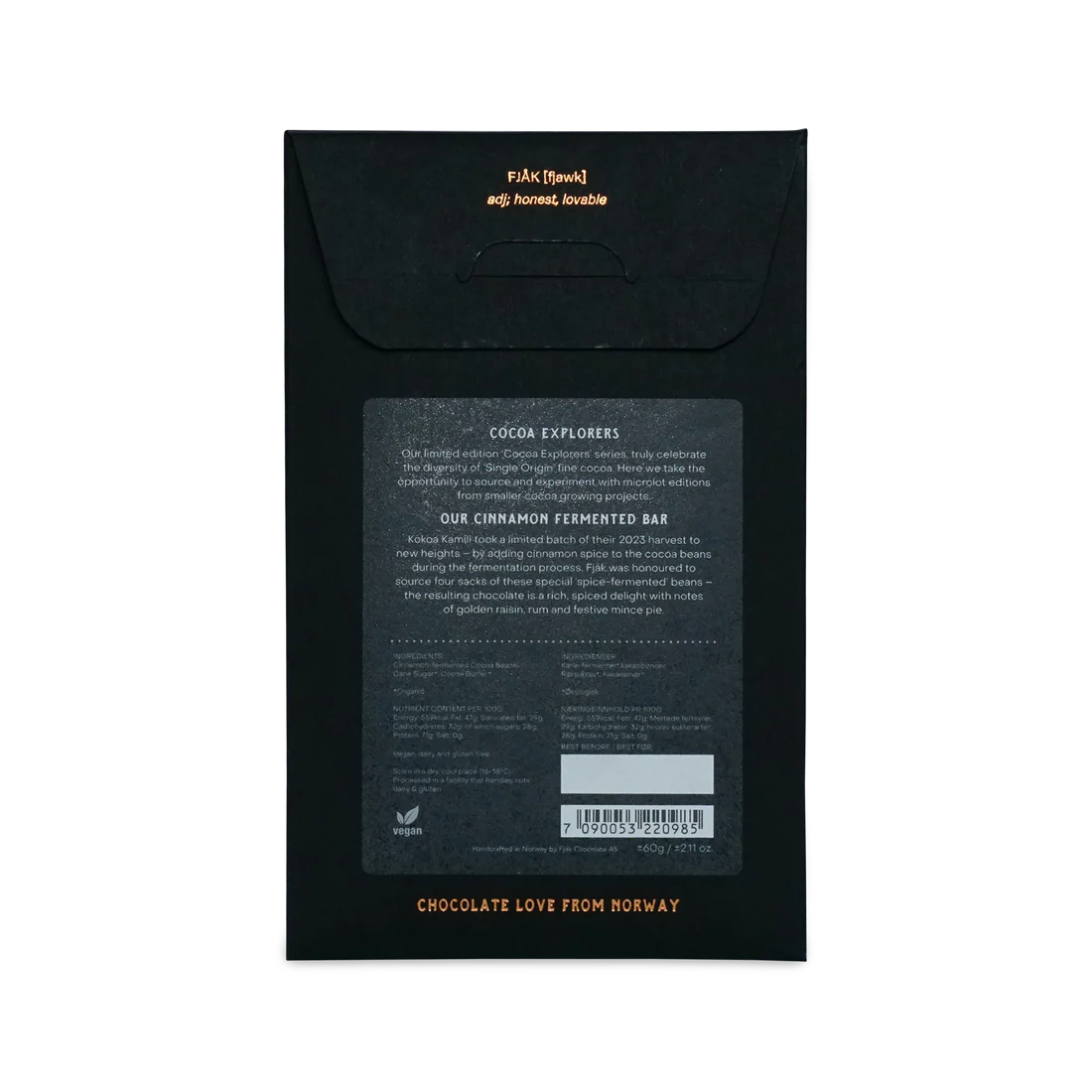 From the Cacao Explorers series by Fjak. A series of limited editions with extra special cocoa. In this case, that can certainly be said because of the cinnamon fermentation. Fjak managed to acquire a total of 4 bags of this cocoa, and that is all. This makes the price of this bar higher than their regular bars. Prices we ourselves also hesitated about for a moment. We were also unable to taste this bar in advance. But because the microlots from Fjak have consistently impressed us so much (with the absolute highlight being the incredible version with Thailand cocoa—but really all of them), we decided to take the risk. And now that we have tasted it, we are, fortunately, still very happy with it. Yes, a higher price, but