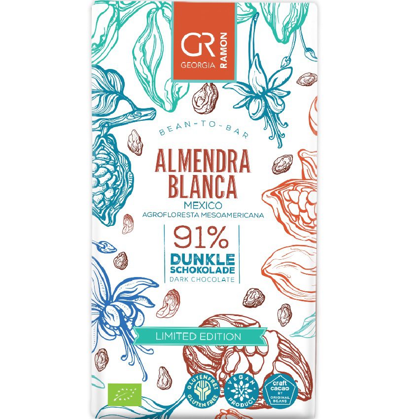 An intense 91% dark chocolate by Georgia Ramon, crafted from the rare Almendra Blanca cacao variety. The name translates to “white almond,” referring to the unusually pale colour of the cacao beans used for this chocolate.