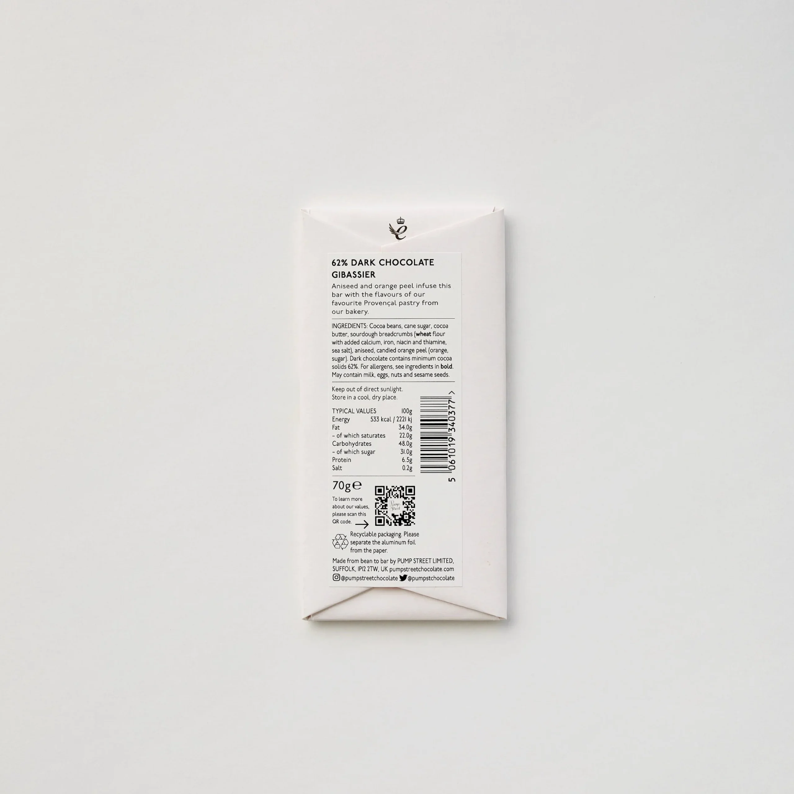 “The flavours of one of our classing bakes, the Gibassier, shine in this bar; Aniseed and orange peel, reminiscent of the beloved and unique Provencal pastry from Pump Street Bakery. It is made with dark chocolate that we make from bean to bar using beans from West Papua. To this we add sourdough breadcrumbs and aniseed, which are ground into the base chocolate and then we add orange peel for bright citrus notes.”