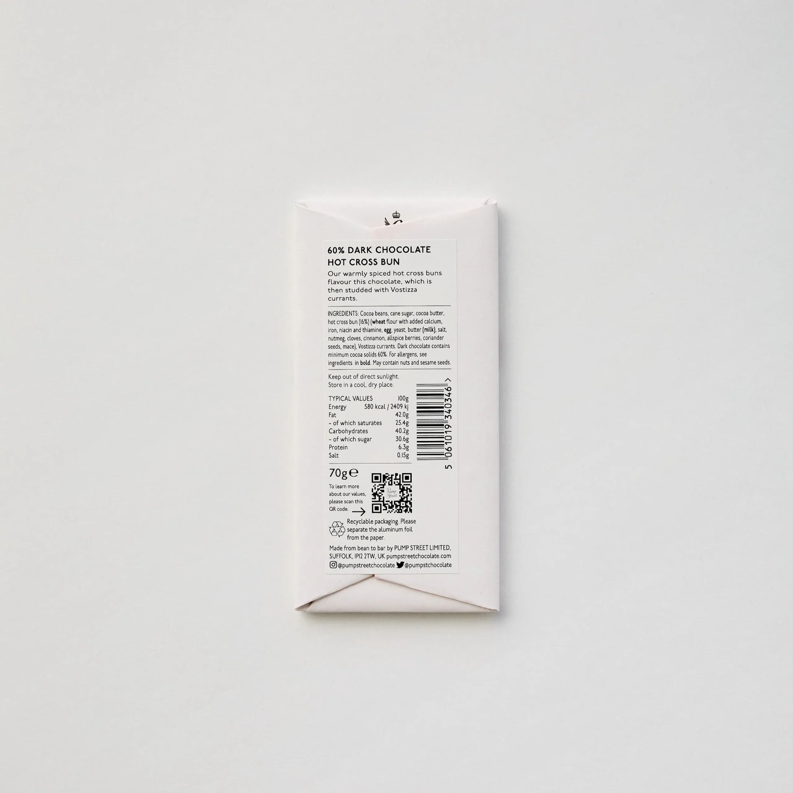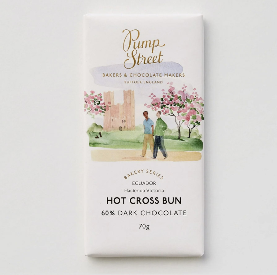 Extra nice for Easter, or to enjoy on Good Friday, but of course this is also a delicious bar to discover on other days. The Hot Cross Bun comes out beautifully in this accessible (60% cocoa) chocolate, and the currants make it complete.