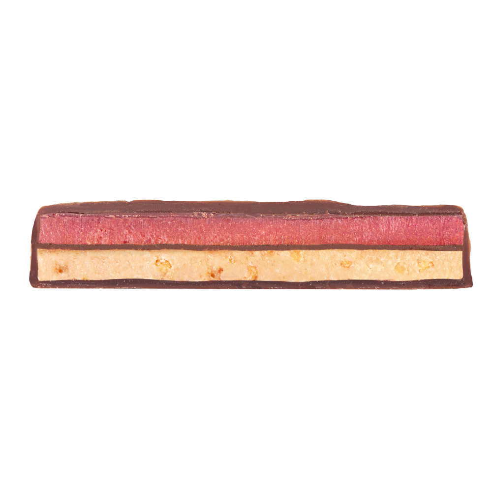 50% oat chocolate filled with a red fruit ganache and almond praline with fruit pieces.