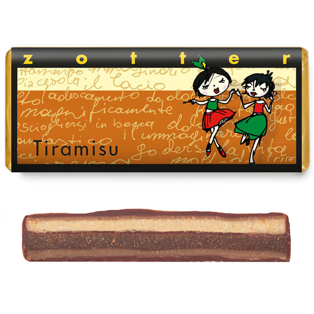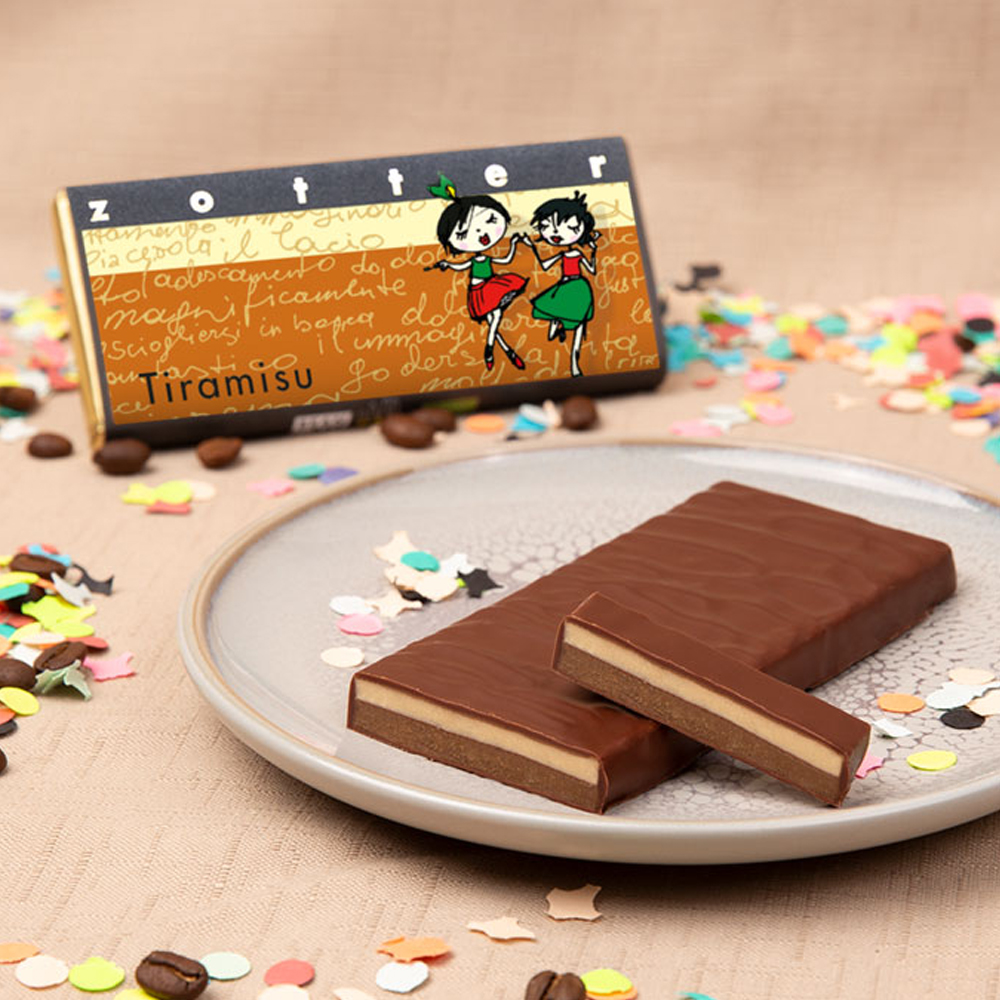 “Più bella cosa non c’è: a layer of mascarpone enriched with almond praline, white chocolate and real Bourbon vanilla, with a second, intense layer of coffee chocolate made from dark chocolate, a coffee couverture, freshly ground Zotter coffee from their own in-house coffee roastery and a generous splash of rum, covered on the top and bottom with an ultra-thin coffee couverture and fully wrapped in a fine milk chocolate coat with a cocoa content of 50%.”